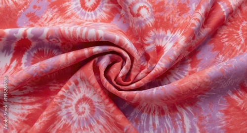 Vibrant 70s fabric with spiral tie dye, coral and lilac hues, and psychedelic brush effects
