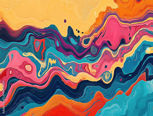Vibrant abstract art painting with flowing colorful swirls in pink orange blue purple and yellow with intricate detail and fluid motion