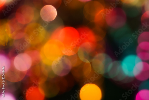 Vibrant abstract background with bright colorful bokeh defocused lights and creative illustration design. Festive pink and orange flickering blurred lights with dark shadow on backdrop