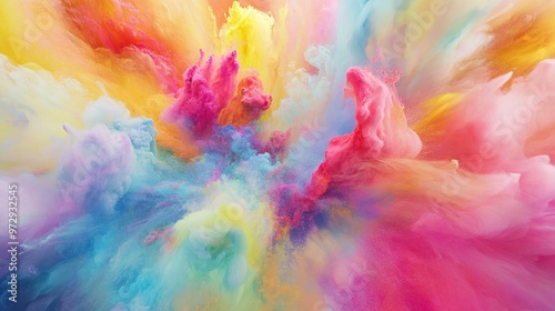 Vibrant abstract explosion of colorful smoke and clouds showcasing a blend of pink, yellow, blue, and purple hues against a soft gradient backdrop