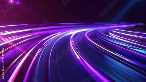 Vibrant abstract light trails in purple and blue colors create dynamic motion effect. smooth curves and glowing lines evoke sense of energy and movement
