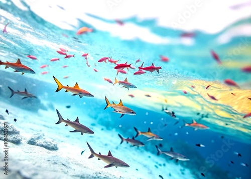 Vibrant Abstract Pattern of Colorful Sharks Swimming in the Ocean Captured with Tilt-Shift Photography for a Unique Perspective on Marine Life