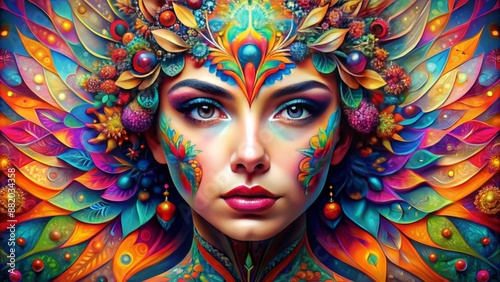 Vibrant abstract portrait of a woman's face, created through digital printing and design, showcases beauty in a kaleidoscope of colors and mesmerizing forms.