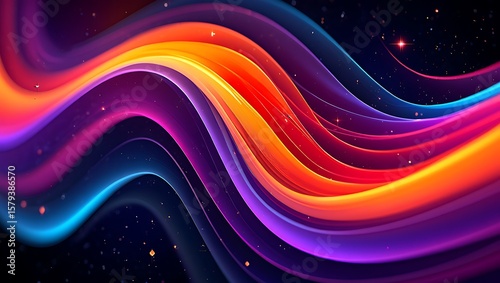 Vibrant Abstract Wave Design with a Gradient of Colors, Luminous Colorful Curves on a Dark Background with Sparkling Accents