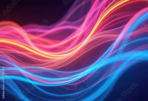 Vibrant abstract waves of pink and blue light create a dynamic visual flow.