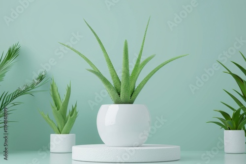 Vibrant Aloe Vera Plant in Modern White Pot on Soft Green Background