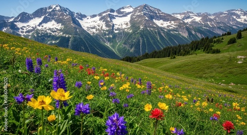 mountain, peak, peak, wildflower, flower, meadow, field, grass, hill, hillside, slope, vale, nature, landscape, scenery, alpine, alps, rocky, range, snow, ice, forest, tree, evergreen, pine, flora, botany, plant, green, blue, white, yellow, purple, red, vibrant, colourful, high-coloured, blooming, growing, hiking, trekking, travel, tour tourism, destination, adventure, exploration, escape, freedom
