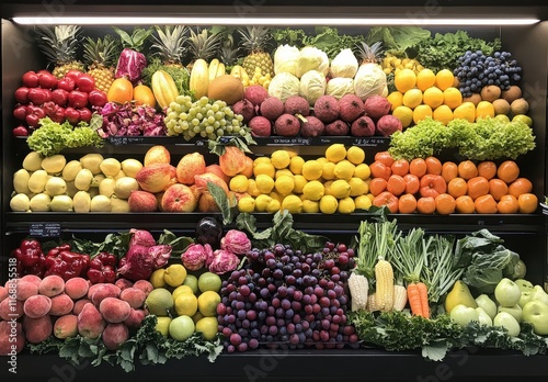 Vibrant and Colorful Display of Fresh Fruits and Vegetables in a Market Setting for Healthy Living and Nutrition Promotion