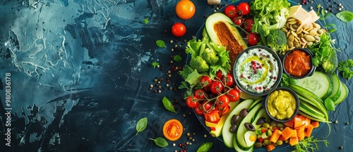 Vibrant and fresh vegetable platter with dips, perfect for healthy eating and meal prep, showcasing colorful ingredients.