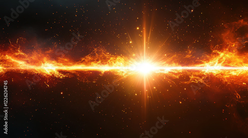 vibrant and intense lens flare radiates from central point, creating fiery explosion of light and energy against dark cosmic background. scene evokes sense of awe and wonder