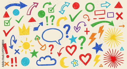 Vibrant and Playful Hand-Drawn Doodle Elements Collection for Creative Graphic Design Projects, Presentations, and Engaging Digital Content