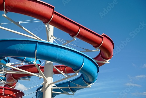 water, slide, water, park, high-coloured, red, blue, purple, sea, wave, surf, ocean, sun, fun, excitement, summer, beach, pool, playground, activity, ride, leisure, joy, lifeguard, happy, splash, family, children, outdoors, recreation, friends, laughter, energy, vacation, warmth