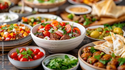 Vibrant Arab Banquet Spread with Friends Enjoying Traditional Homestyle Cuisine in a Relaxing Social Setting The Abundance of Colorful Flavorful Dishes Create a Welcoming