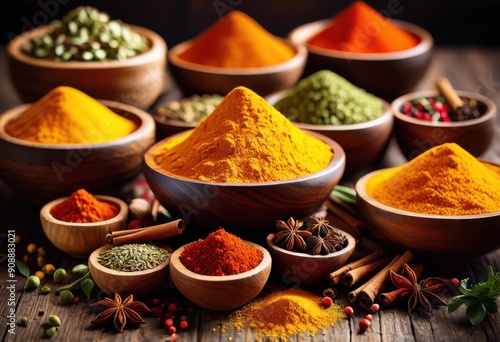 vibrant arrangement colorful spices illuminated sunlight showcasing rich textures natural hues captivating display, illumination, culinary, season, aroma