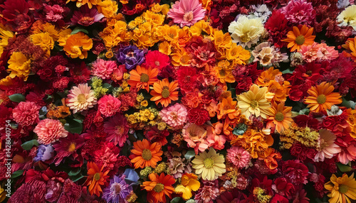 vibrant array of colorful flowers creates stunning natural pattern with tightly packed petals in shades of red, orange, yellow, and purple, evoking sense of joy and beauty