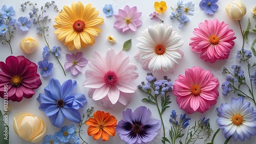 Vibrant array of multicolored flowers including pink, purple, yellow, and blue arranged artistically on a soft white background