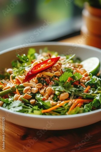 Vibrant Asian-inspired salad in a bowl, featuring fresh green vegetables, crunchy peanuts, sliced carrots, and a chili pepper garnish.