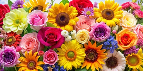 vibrant, assortment, rose, peony, sunflower, daisy, isolated, background, colourful, nature, floral arrangement, garden, beauty, botanical, spring, summer, fresh, blossom, flower petals, closeup, macro, bouquet
