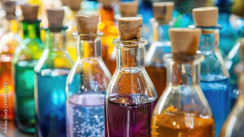 vibrant, colourful, bottle, glasses, corked, liquid, assorted, bright, spectrum, decorative, collection, high-coloured, hue, rainbow, many-coloured, chemistry, laboratory, shelf, display, closeup, row, arrangement, science, background, colours, fluid, mixture, variety, transparent, glass bottle
