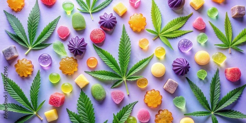 Vibrant assortment of colorful candies and cannabis leaves arranged on a pastel background, creating a visually appealing and textured pattern of sweet treats and natural elements.