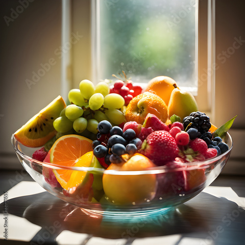 Vibrant Assortment of Fresh Fruits in Glass Bowls on Colorful Backgrounds