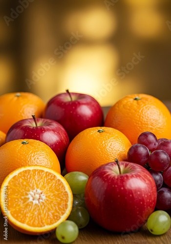 Vibrant assortment of fresh fruits: oranges, apples and grapes on wooden surface