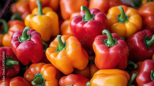 Vibrant Assortment of Fresh Red, Yellow, and Orange Bell Peppers Gathered Together in a Colorful Display at a Farmers Market