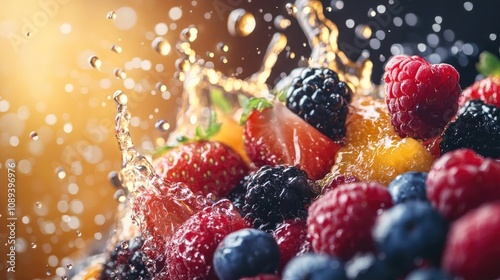 Vibrant assortment of fresh strawberries, blueberries, raspberries, and blackberries with dynamic juice splashes against a dark background