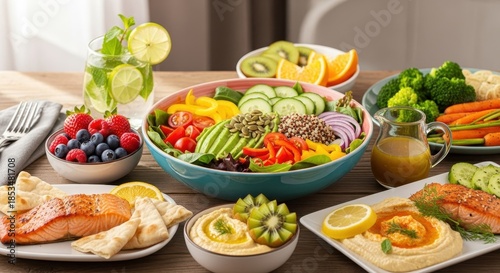 healthy, food, salad, salmon, vegetable, fruit, diet, nourishment, lifestyle, wellness, avocado, greener, tomatoes, cucumber, citrous, berry, carrot, broccoli, hummus, pita, orange, kiwi, refreshing, mint, dressing, bowl, plate, glasses, wooden, table, alimentary, balanced, meal, delicious, colourful, fresh, vibrant, diverse, well-being, vitamin, mineral, ingredient, epicure, culinary, presentation