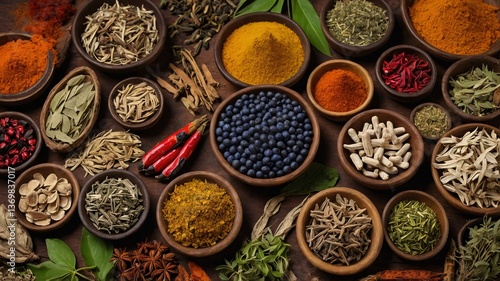 Vibrant assortment of spices and herbs displayed in wooden bowls, showcasing rich colors and textures of culinary ingredients.