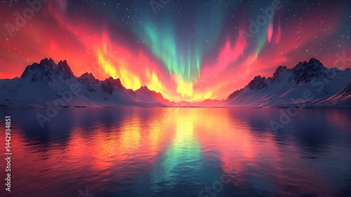 Vibrant aurora borealis reflected in a calm arctic lake, surrounded by snow-capped mountains under a starry sky.