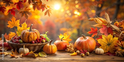 Vibrant autumn display featuring pumpkins and colorful leaves amidst a warm sunset backdrop autumn, pumpkins, colorful leaves, sunset, warm colors, harvest, rustic, wooden table, seasonal display, nat