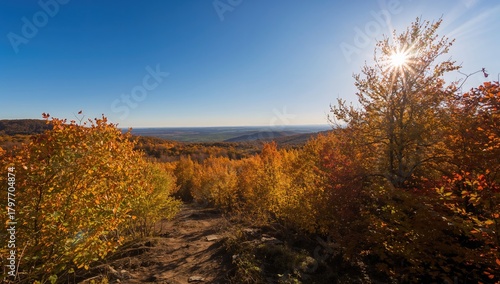 Vibrant autumn foliage along a hiking trail with a hilltop view, seasonal change
