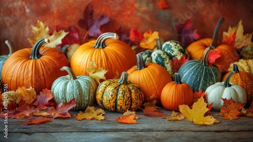 vibrant autumn harvest display artfully arranged heirloom pumpkins, gourds, and leaves on rustic wooden table. rich warm colors, soft natural lighting. cozy fall atmosphere.
