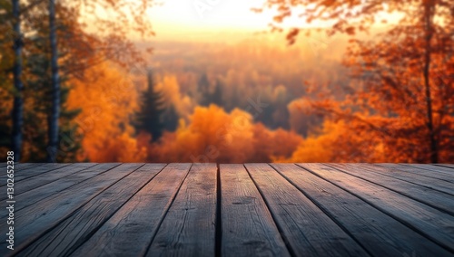 Vibrant autumn landscape with colorful foliage and a wooden deck at sunset near a forested area