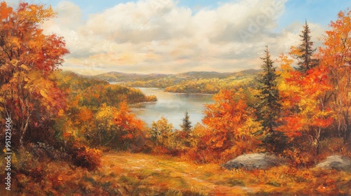 autumn, fall, foliage, landscape, lake, mountain, nature, scenic, tree, forest, environment, outdoors, serene, tranquil, peaceful, overlook, panoramic, countryside, rural, idylli, picturesque, wilderness, view, natural, beauty, colours, water, shoreline, pine, evergreen, deciduous, seasonal, autumn, painting, oil, impressionist, realism, adventure