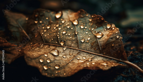 Vibrant autumn leaf with dew drop on wet black backdrop generated by AI