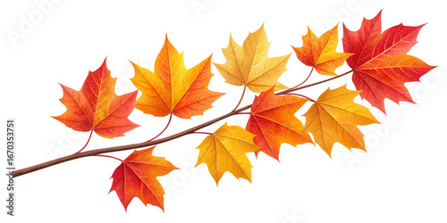 Vibrant Autumn Leaves Branch in Orange, Yellow, and Red on Transparent Background Delicate Fall Foliage Branch, Colorful Seasonal Leaves Isolated on Transparent Background