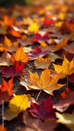 Vibrant autumn leaves on the ground with copy space, texture, nature, maple