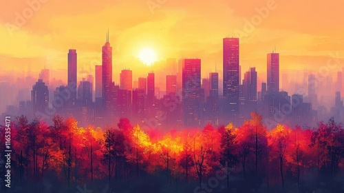 Vibrant Autumn Sunset Over Urban Skyline with Colorful Trees in Foreground and City Silhouettes Against a Golden Sky