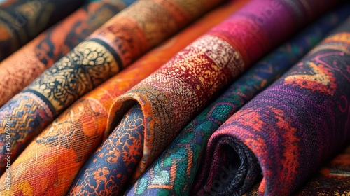 Vibrant Autumnal Fabric Textures Rich Colors Rolled Textiles Detailed Closeup Shot Patterned Designs Ethnic Inspired