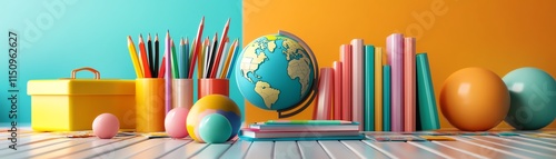 Vibrant backtoschool 3D illustration with books, school supplies, colored pencils, and a globe, emphasizing education, creativity, and learning
