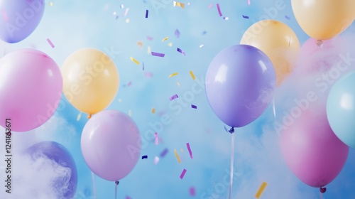 Vibrant balloons drifting across soft blue sky, multicolored confetti cascading, capturing festive spirit of celebration and jubilant moments
