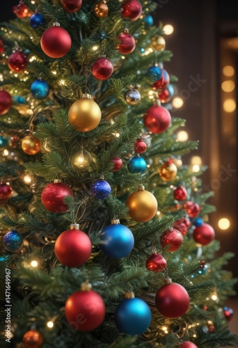 Vibrant baubles adorn a glowing Christmas tree, bokeh lights blur the background , ambiance, festive lights, illuminated