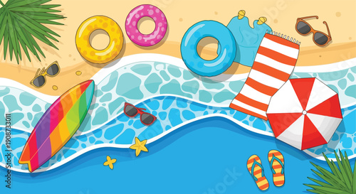 beach, summer, vacation, surfboard, inflatable, ring, sunglasses, flip-flop, umbrella, ocean, wave, sand, tropical, holiday, leisure, fun, relaxation, sun, sunny, coast, shore, water, sea, swim, swimming, activity, recreation, travel, destination, get-away, escape, bright, colourful, vibrant, pattern, design, illustration, graphic