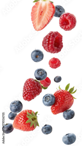 Vibrant berries cascading gracefully on a pure white background creating a visually stunning culinary display