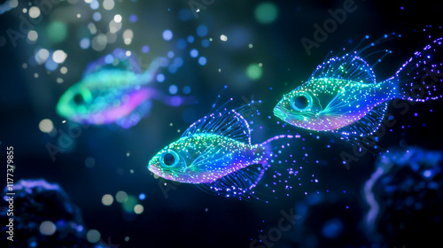 Vibrant bioluminescent fish glowing in shades of blue and green swim through the dark, mysterious depths of the ocean.