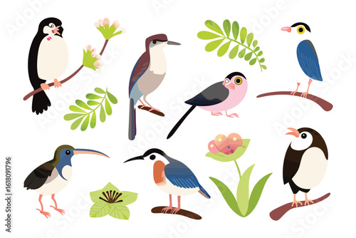 Vibrant Birdlife Illustrations: A collection of colorful birds in various poses, perched on branches amidst leafy greens, creates a lively and charming illustration.