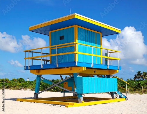 beach, lifeguard, racked, tower, ocean, summer, sun, sky, blue, yellow, vibrant, colourful, sand, coastal, rescue, safety, patrol, tropical, vacation, florida
