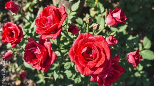 rose, blooming, flower, red, garden, green, nature, plant, flower petals, floral, vibrant, summer, blossom, beauty, freshness, bush, romance, growth, landscaping, love, arrangement, sunlight, peaceful, environment, gardening, botanical, seasonal, spring, decor, natural, serenity, happy, colourful, flowerbed, romantic, aromatic, cheerful, graceful, natural beauty, floral arrangement, bright